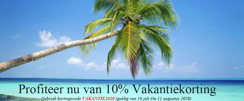 Vul eenvoudig de kortingscode VAKANTIE2020 in, en u ontvangt direct 10% korting ongeacht de bestelwaarde. (geldig van 16 juli t/m 11 augustus 2020)