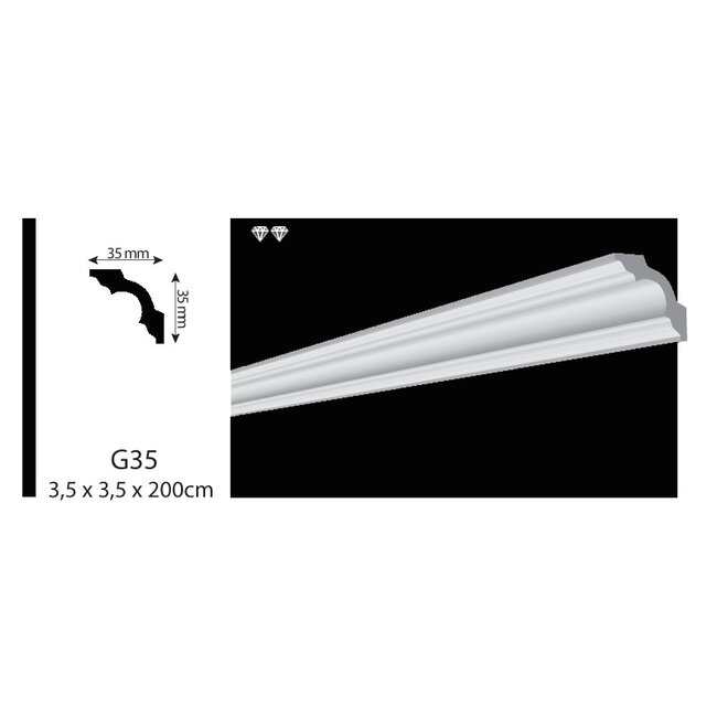 Plafondlijst vervaardigd uit geëxtrudeerd polystyreen voor een decoratieve afwerking tussen wand en plafond.